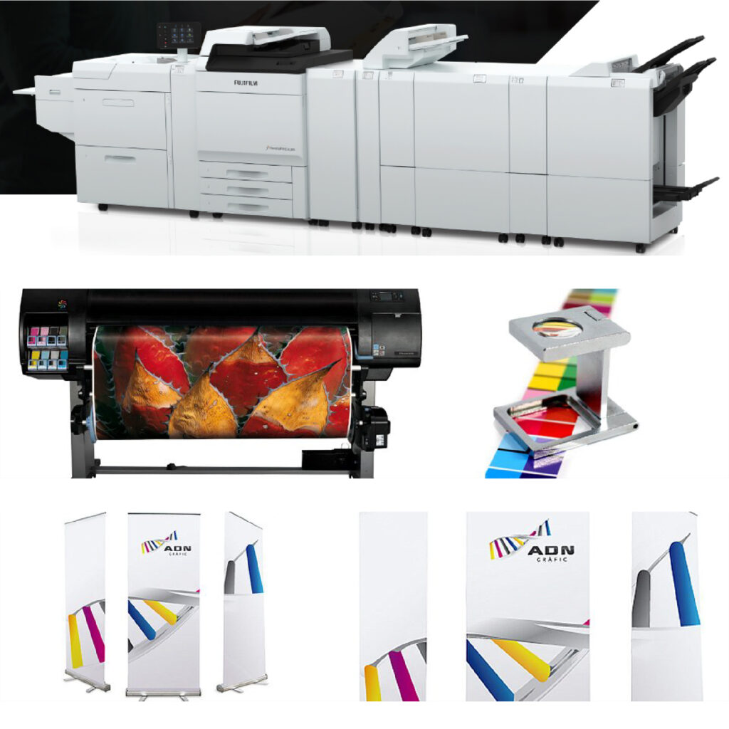 Trabajamos con equipos de última generación para garantizar calidad en todos los colores y soportes. Puedes imprimir desde tarjetas y folletos hasta grandes formatos como posters, roll-ups, metacrilatos, lonas, vinilos o banderolas.